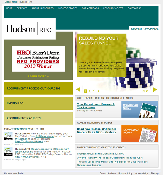 Hudson RPO was formerly embedded as a managed services offering within Hudson’s primary lines of business. We elected to buy a new domain http://www.hudsonrpo.com which offered the advantage of a singular focus on the HR and outsourcing buyer marketplace. Content areas focused on value added insights that would help educate potential clients on the value of RPO to fuel economic recovery. Compelling case studies on a rotating front panel offered immediate legitimacy to the company’s capabilities. A Request a Proposal button and form was featured prominently on the site to funnel new business inquiries to the organization.